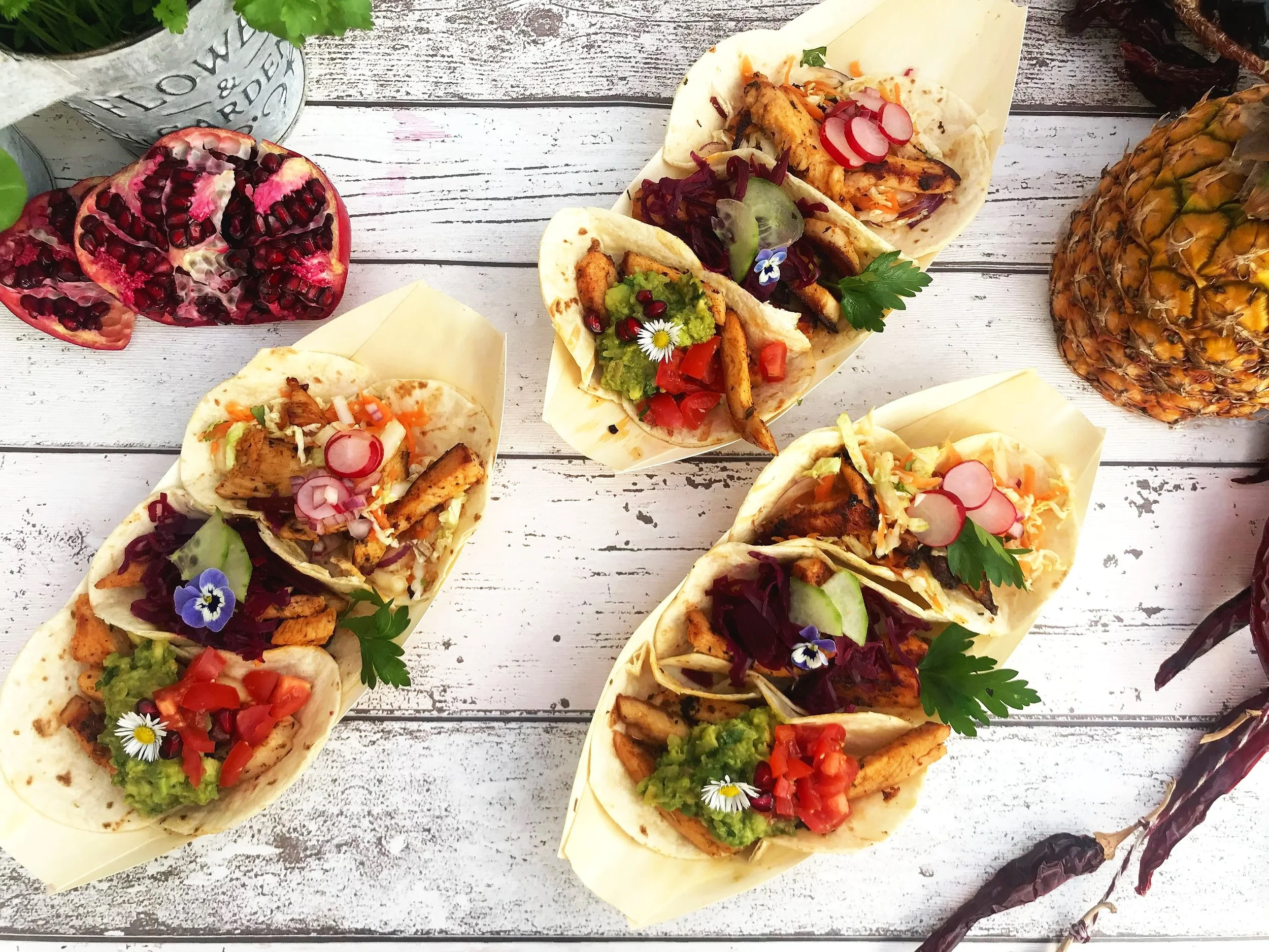 3 fresh tacos per person, prepared on site with bold Mexican flavours. Homemade guacamole and salsas made fresh on the day.